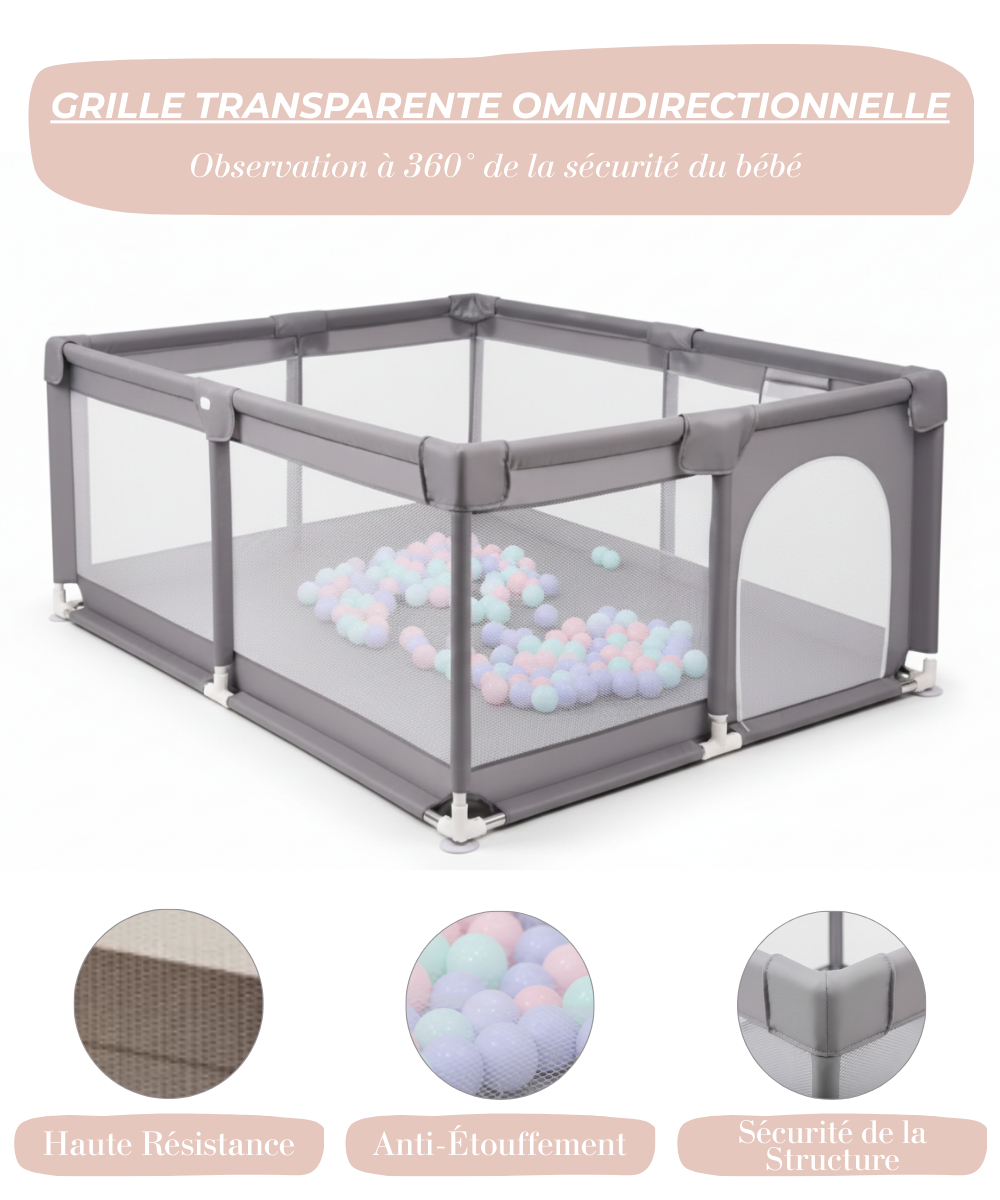 Les parois en mailles respirantes permettent une circulation optimale de l'air tout en offrant une vue complète à 360° sur bébé. Vous pouvez le voir et il vous voit, assurant une surveillance sans effort. La structure en acier renforcé et les ventouses au sol garantissent une stabilité renforcée.