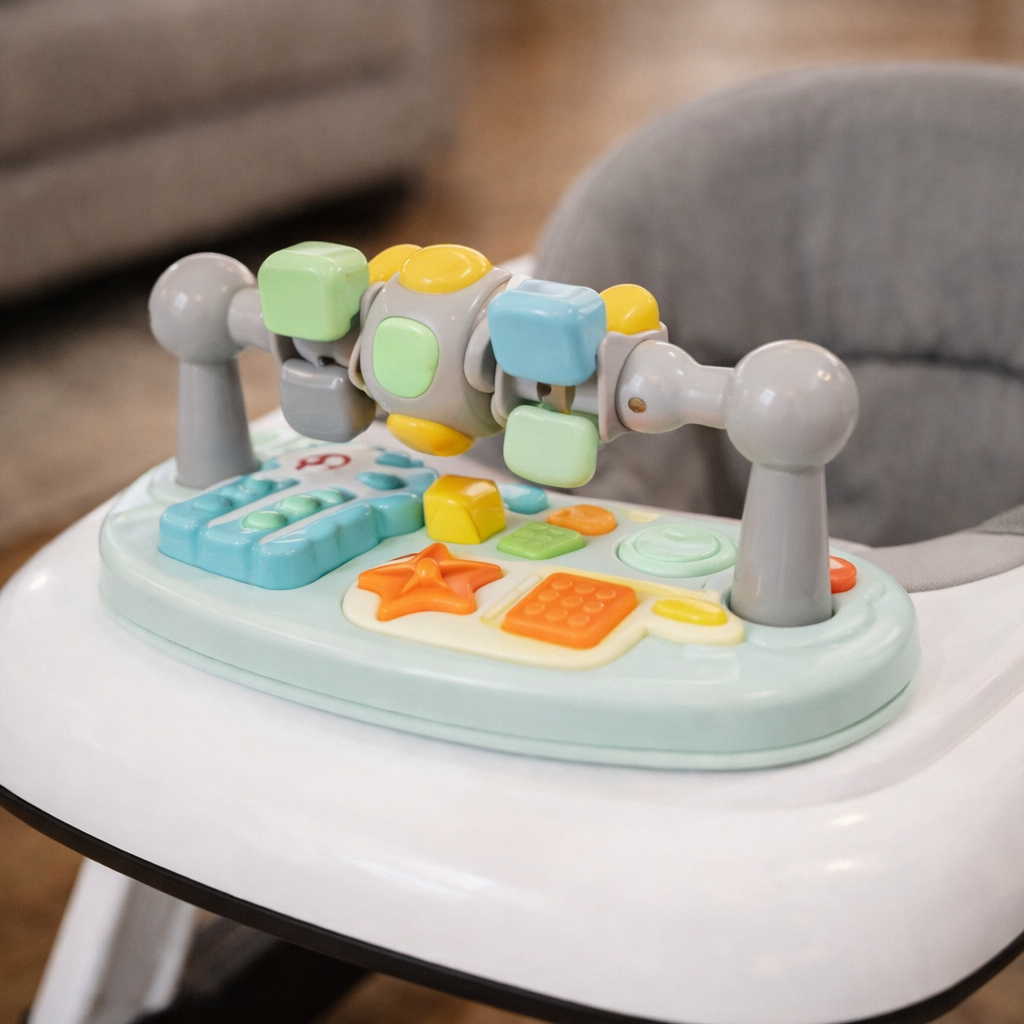 Transformez l’apprentissage en jeu ! Le plateau avant est équipé de jouets colorés et sensoriels pour stimuler la coordination œil-main. Besoin d’une pause ? La tablette se retire facilement pour devenir un plateau lisse, transformant le trotteur en chaise haute d'appoint pour les repas ou le goûter.