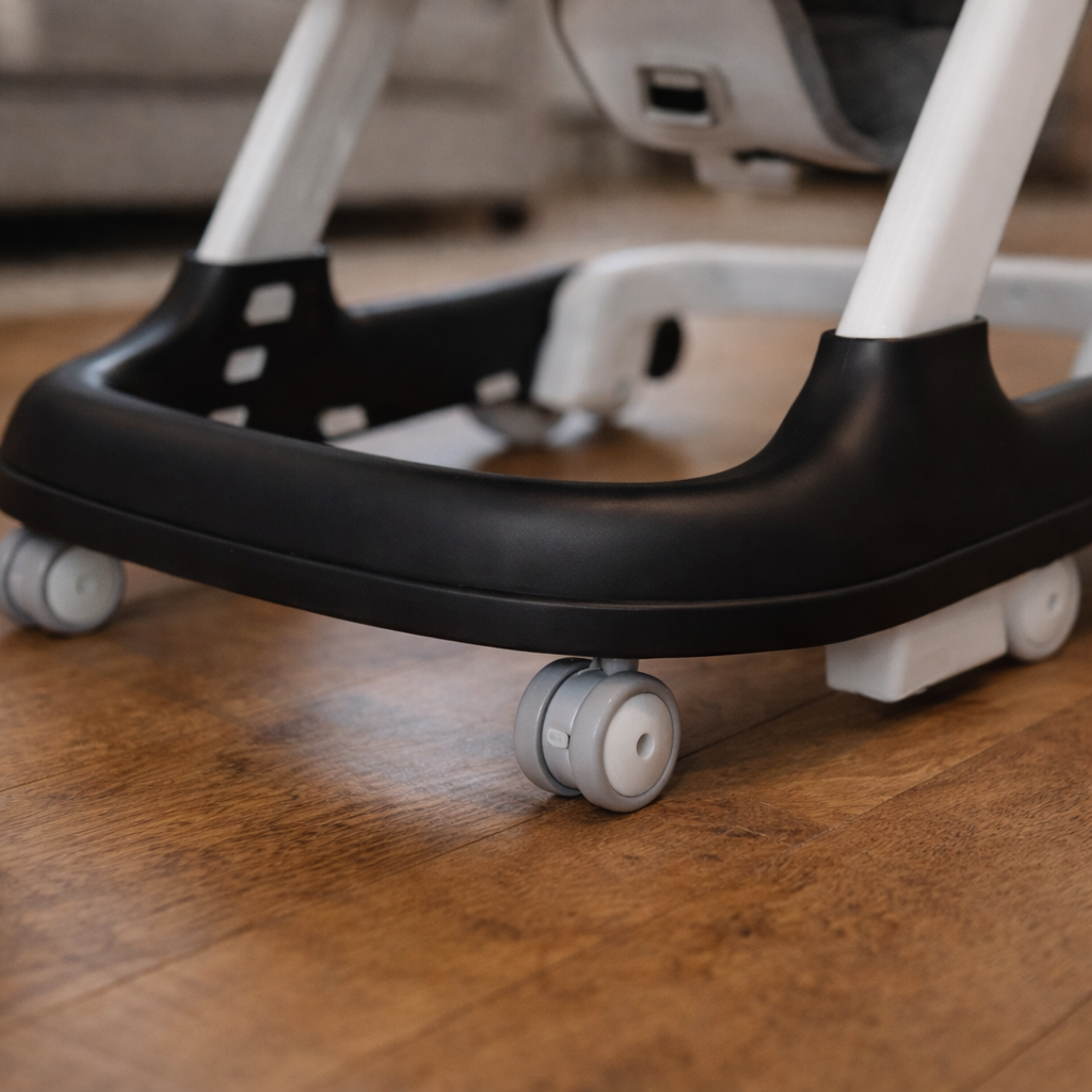 Les roues multidirectionnelles assurent une navigation fluide sans rayer les sols et sans bruit. Si vous manquez d’espace, le trotteur se plie facilement en quelques secondes pour se ranger sous un lit ou derrière un canapé.